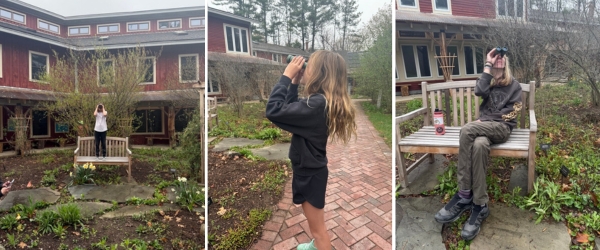 Photos by Shelby Morelli of campers practicing with binoculars. Birding: Speaking of birds, late April and early May are super exciting times to head outside and look/listen for birds. Many warblers and swallows are just returning from migration, bringing lots of beautiful color and music to our fields and forests after the stillness of winter. The sparser leaves also make spotting birds easier in spring than with full foliage in the summer. Waterfowl is also much more abundant on our rivers, ponds, and lakes. Grab a pair of binoculars and go exploring!