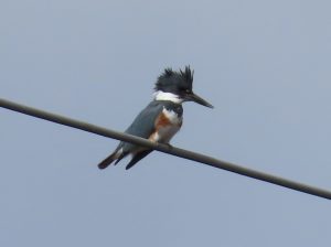 If you’re paddling on one of New Hampshire’s rivers or lakes this summer, there’s a good chance you’ll hear the distinctive rattle of the Belted Kingfisher (Megaceryle alcyon). As its name implies, this species feeds almost entirely on fish, which it captures in shallow water. Kingfishers hunt in two ways, either from a perch or by hovering over the water. When a fish is detected the bird dives into the water, grabs the prey with its bill, and then brings it back to a perch to swallow whole. Because they are visual predators, kingfishers are not often seen near muddy rivers or areas with waves that make it difficult to see below the surface.
