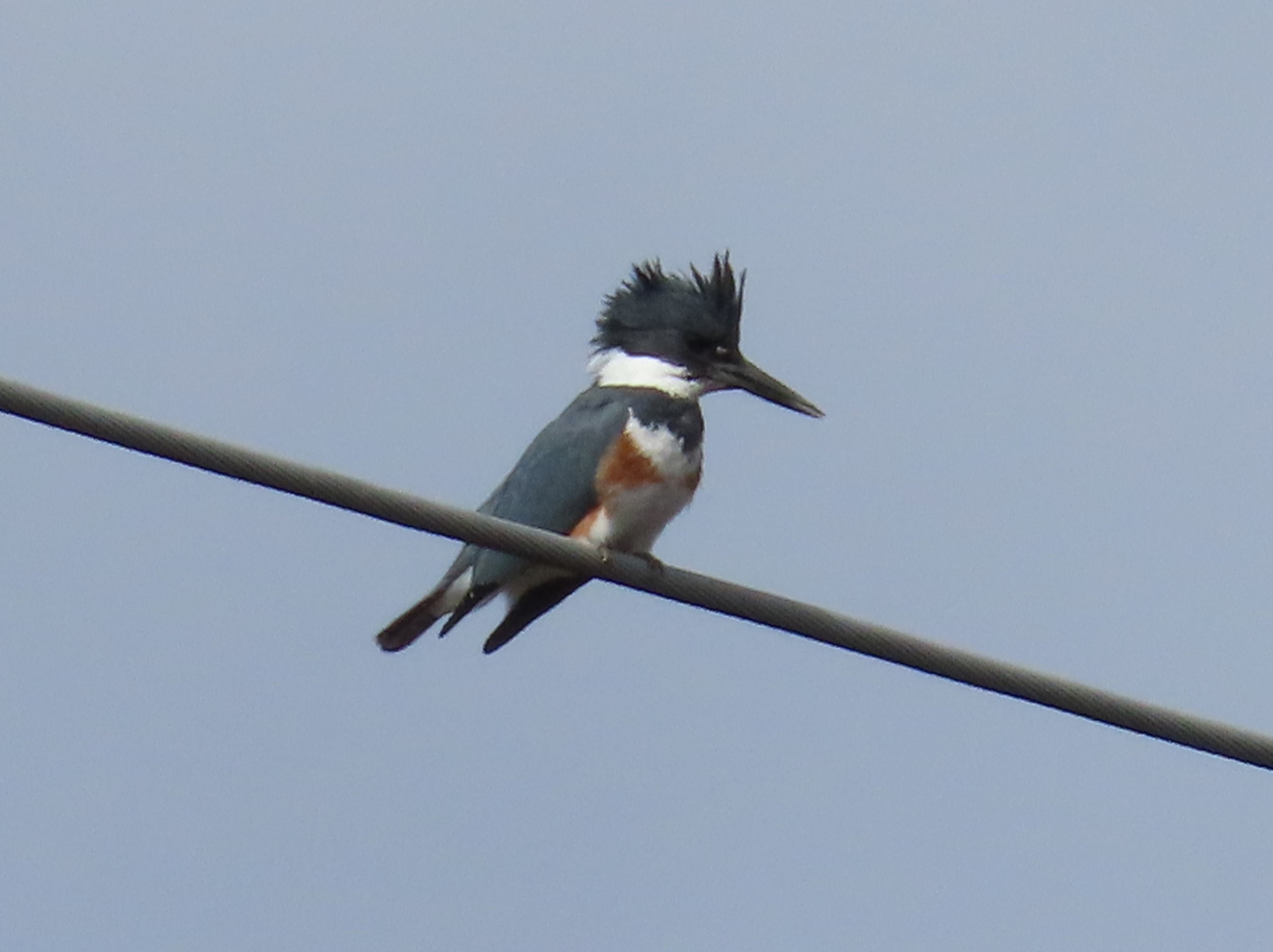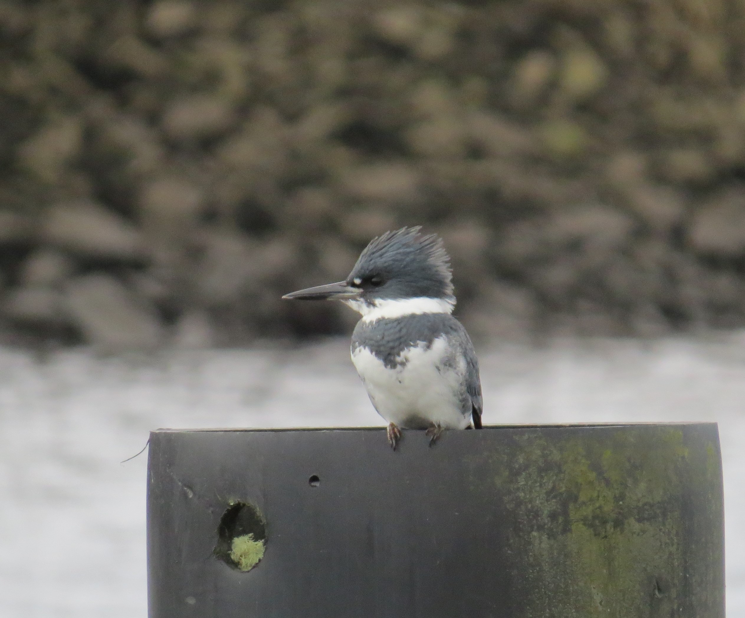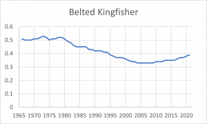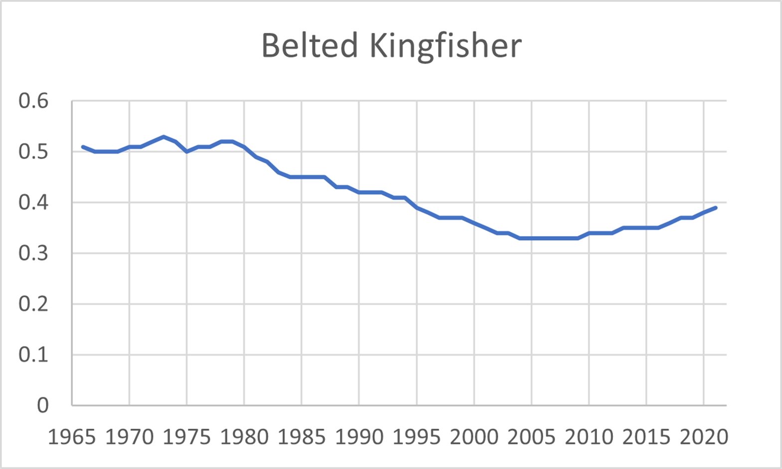 Kingfisher populations have been in slow decline for decades, but there are no clear explanations for this trend. It’s been speculated that contaminants such as DDT and PCBs could be a factor, as has been demonstrated for other fish-eating birds, but levels of these toxins in kingfishers have been low where tested. Historically the species was persecuted at fish hatcheries, but this is far less common now. Given their nesting habitat, a third possibility is that bank stabilization along rivers is reducing the extent of eroding banks in which to nest, as has been documented for Bank Swallows in some areas. There is clearly much to learn about some aspects of Belted Kingfisher ecology as it relates to conservation.