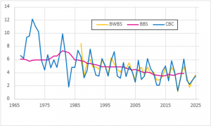 The Blue Jay’s bright colors, loud voice, and in-your-face attitude make it one of the most familiar birds in the eastern United States. Because they are so visible, it is also easier to notice their absence, and backyard birders are quick to get concerned when their jays seem to disappear. This is usually in the winter, but not every winter, and the reason is a simple but little-known fact: Blue Jays migrate. There will always be a few that stay put all year, but others may move as far south as Georgia during their September/October migration period. The number that leaves is tied to the availability of acorns and other nuts in the fall. When these are abundant, more jays remain in New Hampshire for the winter. Those that leave return in April and early May, and you can sometimes see large loose flocks moving north during the day along our major river valleys. Figure 1 shows the ups and downs in our local winter populations quite clearly, and also that these sometimes-dramatic fluctuations are not present in the summer.