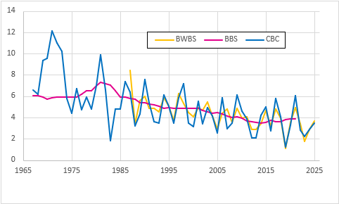 The Blue Jay’s bright colors, loud voice, and in-your-face attitude make it one of the most familiar birds in the eastern United States. Because they are so visible, it is also easier to notice their absence, and backyard birders are quick to get concerned when their jays seem to disappear. This is usually in the winter, but not every winter, and the reason is a simple but little-known fact: Blue Jays migrate. There will always be a few that stay put all year, but others may move as far south as Georgia during their September/October migration period. The number that leaves is tied to the availability of acorns and other nuts in the fall. When these are abundant, more jays remain in New Hampshire for the winter. Those that leave return in April and early May, and you can sometimes see large loose flocks moving north during the day along our major river valleys. Figure 1 shows the ups and downs in our local winter populations quite clearly, and also that these sometimes-dramatic fluctuations are not present in the summer.