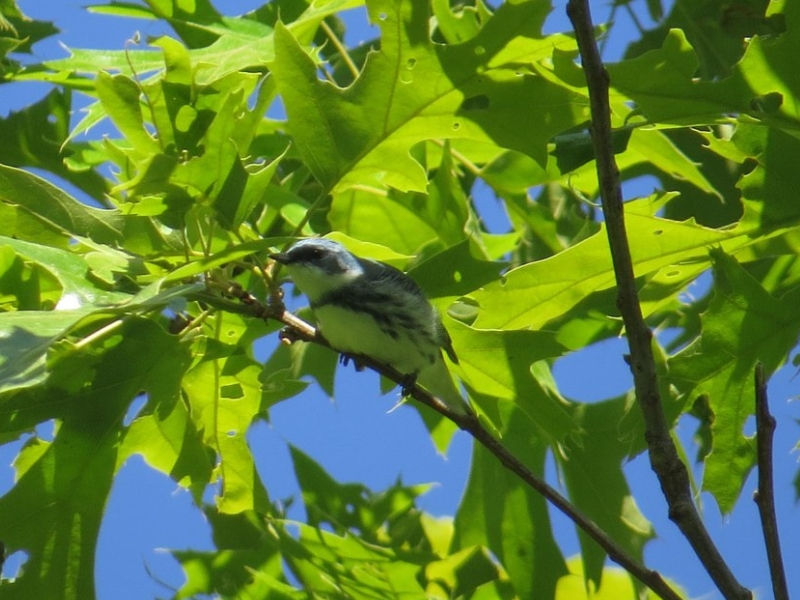 May is famous for the peak of spring migration in New Hampshire, particularly of warblers, and the third Friday in the month is also “Endangered Species Day.” To honor both of these important items on the calendar, this month’s special additional “Bird of the Month” is a warbler on the NH Threatened and Endangered Species List. The Cerulean Warbler was listed as “threatened” here in 2017 due to declines both locally and nationally. This is a small warbler, so named because of the male’s sky-blue head and back. Because Ceruleans stay high in trees however, this coloration can be hard to see and the view most people get is of the clean white underparts broken by a black breast band.