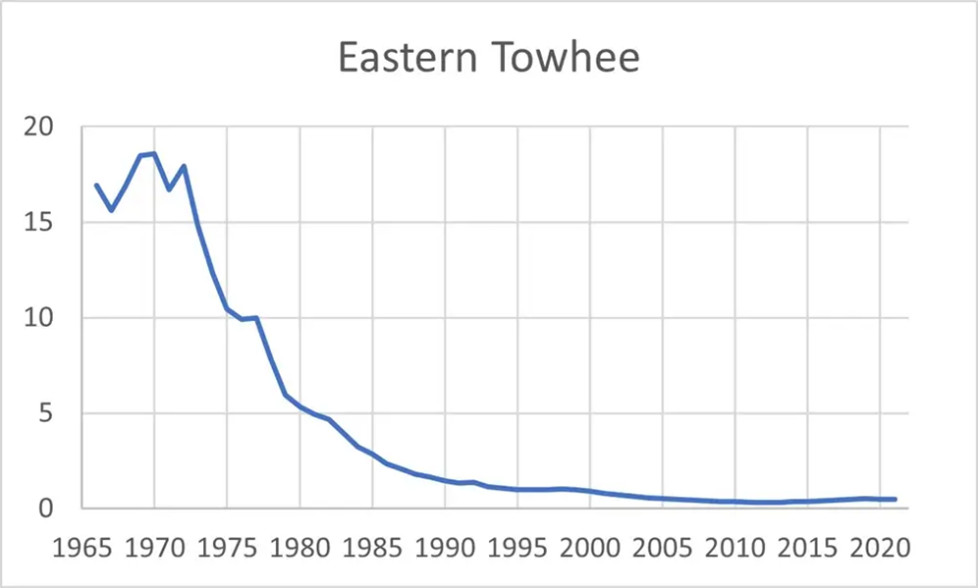 Towhees are a species of early successional habitats, and like other such species, their populations are in steep decline across most of the range (Figure 1). They probably reached their peak abundance in the late 1800s or early 1900s when abandoned farmland was being replaced with shrubs. Some of those shrublands continued to mature into forest while others, especially in southern New Hampshire, were developed for commercial or residential purposes. Today, most of the state’s towhees are in powerline cuts and pine barrens. A few are also found regularly on low rocky mountaintops dominated by low shrubs (e.g., blueberries) and sometimes in brushy bogs (e.g., NH Audubon’s Ponemah Bog Sanctuary). The good news is that most of these habitats are actively managed to prevent reversion to mature forests, so towhees are likely to persist, just in numbers significantly lower than 50-60 years ago. Towhees are now rare north of the White Mountains.