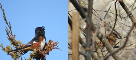 Towhees in the northern half of their range, including New Hampshire, migrate to the southeastern United States each fall. Here they join birds that don’t migrate at all, and both populations mix together in foraging flocks. In March and April, the resident birds are preparing to breed just as the migrants start to return north, thus limiting the potential for more intense resource competition. As our climate warms, more and more towhees linger into the winter in the northern portion of their breeding range, including New Hampshire. Numbers vary depending on the severity of the winter seem to be on the increase.