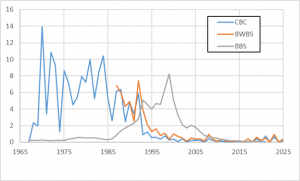 Budworm operates on roughly a 40-year cycle, however, and in the early 2000s, a new outbreak started in southern Quebec. Shortly thereafter, the number of grosbeaks visiting New Hampshire started to grow again. You can see the early signs of this in Figure 1, and while we’re still a long way from the numbers during the last outbreak, there are signs that there are more grosbeaks to come. Remember that peaks occur every other year, so there will still be winters when grosbeaks will be extremely hard to find. Signs in the fall of 2025 suggested that this winter would be a relatively good one for the species, with higher-than-average numbers in both October and November (Figure 2). At present, the largest flocks are still north of the White Mountains, where there are scattered reports of over 100. Numbers in southern NH were gradually building in December, mainly in the southwest, with mostly single birds south and east of Concord. With luck, grosbeaks will continue moving south and grace more feeders by the time the Backyard Winter Bird Survey occurs in early February.