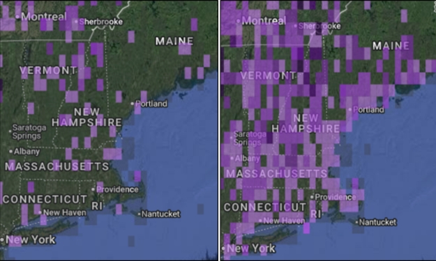 The Evening Grosbeak’s heyday in the Northeast, which lasted roughly from 1950 to 1990, coincided with a large outbreak of spruce budworm in eastern Canada. The caterpillars of this moth feed on spruce and fir and can severely impact forests at high infestation levels. During these periods, several species of birds, including the Evening Grosbeak, capitalize on the abundant food and produce more young (see also our Bird of the Month on Cape May Warblers). But as the outbreak wound down, the grosbeaks lost an abundant source of food and their populations declined or shifted west. Thus, while local breeding populations persisted for another decade (Figure 1), the huge winter numbers became a thing of the past in the absence of a large population to our north.