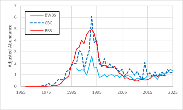 The rapid rise of House Finch populations in the East was curtailed in 1994 by the emergence of a conjunctivitis strain that caused considerable mortality, and numbers dropped quicky to the much lower levels where they remain today (Figure 1). The birds’ high vulnerability to this disease was likely due to low genetic diversity since all House Finches east of the Great Plains descended from those original birds released on Long Island. Numbers remained low for most of two decades but now appear to be increasing slowly, a sign that perhaps the species has evolved some resistance to the disease Conjunctivitis is still present in New Hampshire finches, so if you see birds at feeders that are lethargic and have crusty or swollen eyes you should take in the feeders, clean them thoroughly, and wait two weeks before putting them back outside. This will minimize the risk of transmitting the disease to other birds.
