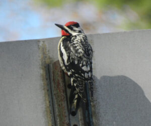 (Story and photos by Pam Hunt) If you hear an erratic “rat-a-tat-tat-tat” echoing from your roof, siding, or gutters in April or May, chances are that a male Yellow-bellied Sapsucker