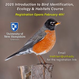 On February 4, UNH Cooperative Extension will open registration for the: 2025 Introduction to Bird Identification, Ecology & Habitats Course. This is a very popular online & field-based course with