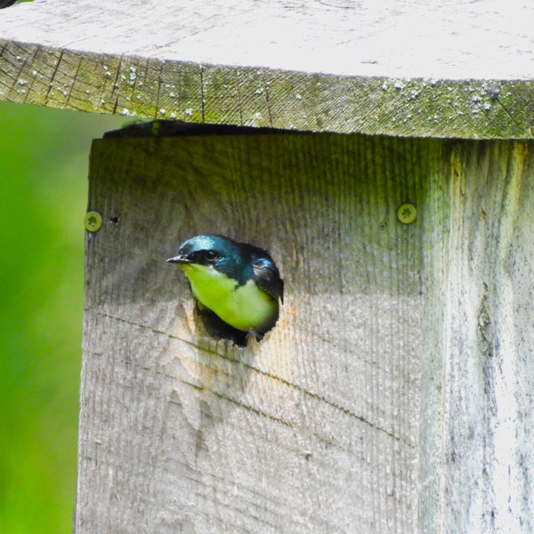 Photos, from top: View across the pollinator meadow, by Dyanna Smith; Tree Swallow in nest box, by Anita Fernandez.