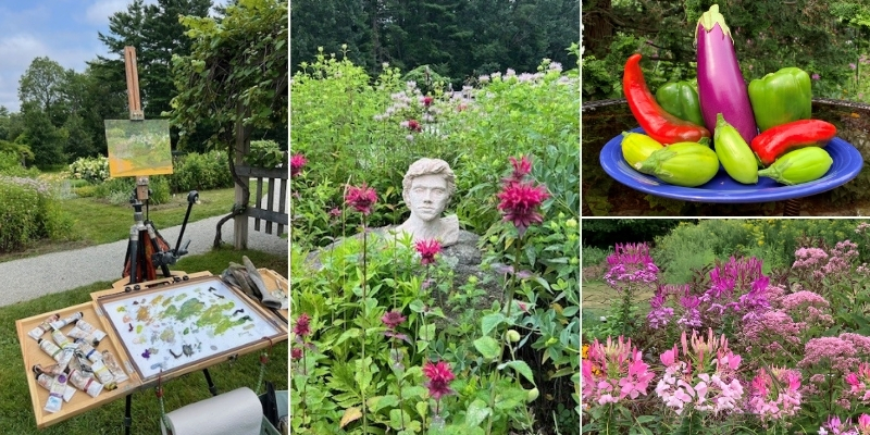 The volunteer gardening team, who lovingly tend to the space all year round, rallied around Dee and the event. Our multi-talented team members created and offered sculptures, bud vases bursting with blooms from the gardens, and put in extra work to have the gardens in tip-top shape. Walt Swist, one of our key Vegetable Garden team members, created an indoor photography exhibit to highlight the yield harvested from our own gardens. Walt’s fun and artistic photo arrangements are a light-hearted capture of the real impact our gardens at Massabesic have. Last year, we donated over 500 pounds of food to the New Horizons shelter in Manchester, and we’re on track for a similar yield this year.