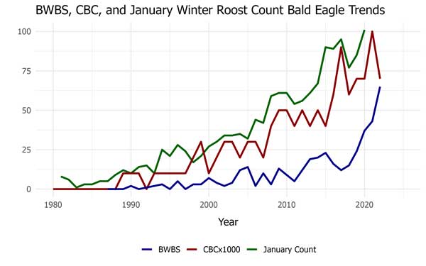 Decades of data show that data collected on Bald Eagles during the two-day Backyard Winter Bird Survey and annual Christmas Bird Counts closely follow the trend of the larger, more labor-intensive historic Winter Roost Surveys. NH Audubon can therefore use these data collected as a part of larger surveying projects to track Bald Eagle population trends as large-scale monitoring efforts are scaled back. By participating in these community science initiatives, you are helping NH Audubon to gather important data and understand population trends for many species, including Bald Eagles. Learn more and participate by following the links above.