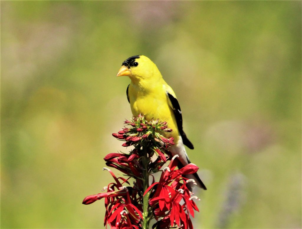 Photo: American Goldfinch on Cardinal Flower in the Massabesic Center Demonstration Gardens, by Walter Keane.