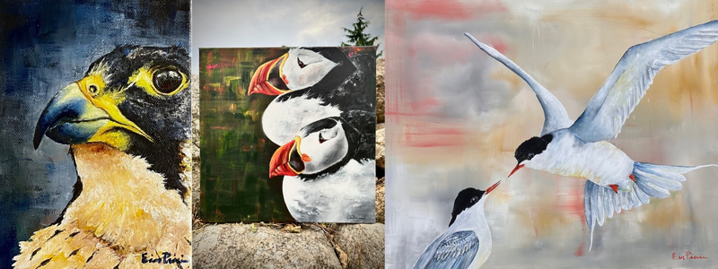 Artist’s Bio: Erin is a New Hampshire-based artist whose work celebrates the quiet beauty and individuality of the birds. Her paintings focus on the simplicity of bird profiles, each rendered with careful detail and set against vibrant, abstract backgrounds that let their personalities take center stage. Inspired by years of birdwatching and a lifelong love of nature, Erin sees each piece as a portrait- a way of honoring both the species and the singular experience of encountering it. Her work blends realism and reverence, inviting viewers to slow down, observe, and reconnect with the natural world.