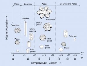 The reason all snowflakes are unique is because of how they are formed. Way up in the atmosphere, specks of dirt, dust, ash, etc., float around with condensed water droplets. Those tiny water droplets attach to a speck and freeze into an ice ball. This is the foundation of a snowflake, or snow crystal. Since that ice ball is heavier than the original speck, it begins to fall, and that process of falling is what forms the snowflake. The snowflake shape and size are determined by the humidity, temperature, and how far it falls to the ground, as demonstrated in Fig. 1. Since conditions are never exactly the same, every snowflake will look slightly different.