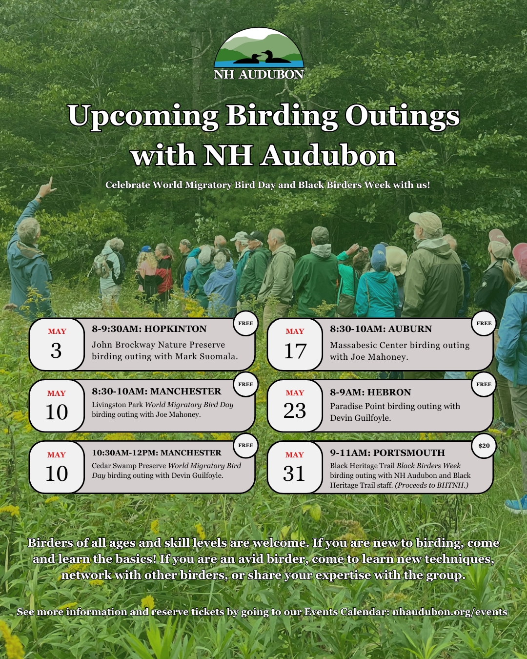 - May 31, 9am: Black Birders Week Tour with Black Heritage Trail of New Hampshire in Portsmouth.