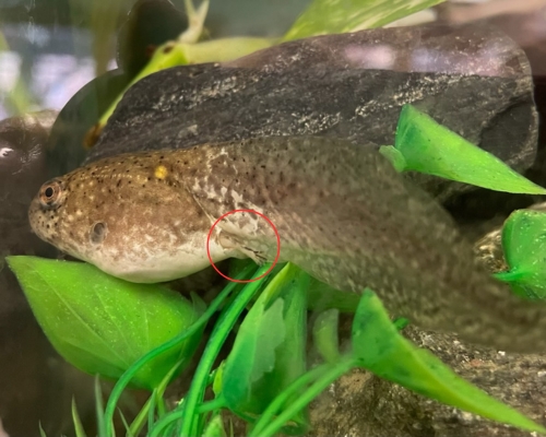 The Northern Leopard Frog tadpoles are growing up fast! This little one at our McLane Center has begun sprouting legs, with the hind legs coming in first and the front legs not far behind. Check out the picture to see the toes coming off the leg, soon to be used for jumping! It’s also developed a spiracle, which is helping it breathe while still spending time in the water.