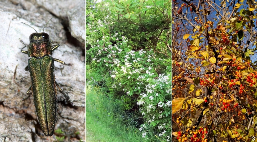 Answers: 1: Emerald Ash Borer (Agrilus planipennis), photo by Tom Murray via Flicker. 2: Multiflora Rose (Rosa multiflora), photo via NH Garden Solutions blog. 3: Asiatic Bittersweet (Celastrus orbiculatus), photo via UNH Extension blog.