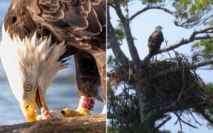 Left photo: Color band ID confirmed for 17 year-old ‘Red 3_U’ on Ossipee Lake breeding territory by Nadine Wright. Right photo: Sentry-like adult eagle perches at newly-discovered nest on a Tuftonboro island by Iain MacLeod.