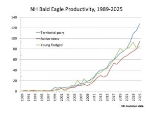 We confirmed 94 pairs incubating eggs, but found only 62 pairs that fledged at least one young. This relatively poor productivity was likely due in part to a very wet early Spring, a time when recently hatched eaglets are most vulnerable. We tallied a total of 85 fledged juveniles in 2025 and found only one Granite State nest with three fledglings, far fewer than the five nests with three chicks in 2023, when a record-high 93 eaglets fledged.