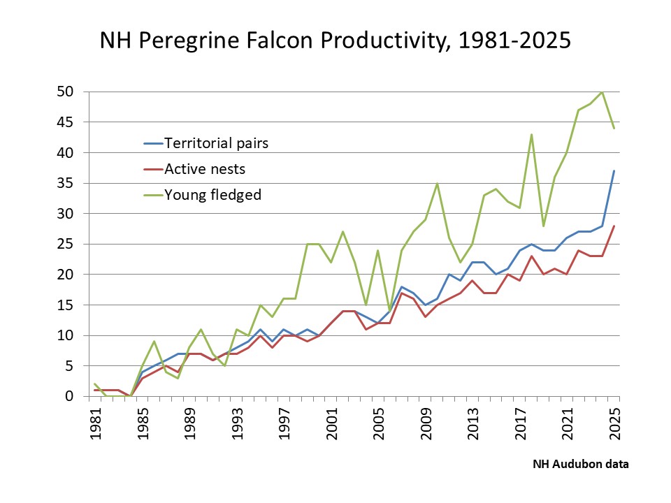 We documented 28 pairs incubating eggs, but only 21 pairs hatched, which is the same number as 2024 but a lower hatch rate (75% vs 91%). Total number of Peregrine fledglings fell from 50 young in 2024 to 44 in 2025. But NH recovery data suggests that rebounds often follow down years, so more territorial pairs now could lead to more fledglings next year.
