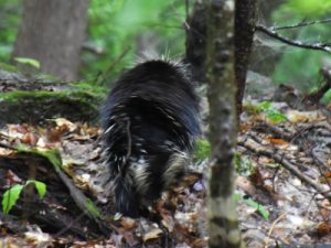 Thursday, I traveled out to the Seacoast, meeting up with Director of Communications Dyanna Smith at the Bellamy River Wildlife Sanctuary in Dover. The temperatures cooled from the mid-nineties to the high seventies, lending to a nice tour of the property. We were closely watched by a female deer as we walked the trail, and some highlights of that visit were a “Dog Vomit” slime mold and a Tiger Crane Fly, with beautiful iridescent wings and bold black patterning. Friday afternoon offered a return to the Monadnock region with Wildlife Biologist Diane DeLuca at the Deerfield Wildlife Sanctuary in Deerfield, where we found several other species of dragonfly and damselfly, along with Threeleaf Goldthread, Northern Starflower, and a large, curved beaver dam. I ended the challenge with visits to two sanctuaries on Saturday, June 28. Ecologist and volunteer Tracy Brunner led a group around the Massabesic Audubon property in Auburn, where we heard and observed Tree Swallows, Veery, Pine Warbler, and a Ruby-throated Hummingbird visiting the gardens. We also found evidence of a black bear. In the afternoon, I drove up to Hebron, walked along W. Shore Rd. and along the 2.1-mile trail of Bear Mountain sanctuary. The most exciting “find” of the trip was a North American porcupine, moving along the ground and seemingly disinterested by our presence, slowly turning and leaving us to the trail.