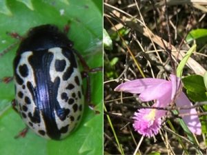 Reflecting on my own experience during the challenge, I saw some new species, some personal favorites, and learned a few things about both the wildlife and the land they inhabit. I began the week in Antrim at the dePierrefeu-Willard Pond Wildlife Sanctuary (Willard Pond). I found several damselflies, a small American Toad, an Orb weaver spider that I only noticed because of its metallic colored abdomen, a Red Spotted Purple and a Common Buckeye Butterfly, and an attention-grabbing black and white Calligrapher beetle. Two days later it was up to the Gertrude Keith Hoyt & Edward Eaton Hoyt, Jr. Wildlife Sanctuary in East Madison to meet with sanctuary steward and guide Heather McKendry to find more species of dragonfly and damselfly, some bullhead near the wetland cove off the Heath View Trail, a Tiger Swallowtail that finally decided to land for only seconds, and a mating pair of caddisflies that perplexed us with two sets of wings until later reviewing the photos. Wednesday, I stayed “close to home” at our state headquarters in Concord, the McLane Center. Biologist Pam Hunt led us out to Turkey Pond to locate about a dozen species of dragonflies and damselflies, including the tiny Sedge Sprite and the Calico Pennant, which looks like it belongs on the castle grounds in Alice in Wonderland. My favorites at this location, though, were the pond plants: purple pitcher plant and the native orchid Rose Pogonia.