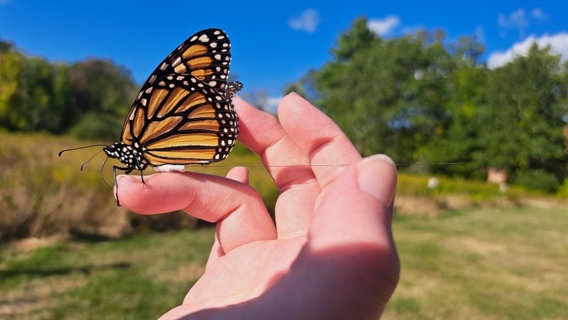 Monarchs are one of the most recognizable butterfly species in North America due to their large size and striking coloration. They are also unique as the only species of butterfly known to undertake long-distance, multi-generational migration. Unfortunately, these formerly abundant butterflies have experienced dramatic population declines since the 1990s. To better understand and protect them, NH Audubon biologists are attaching tiny radio transmitters—called Lotek nanopins—to migrating Monarchs to track them along their migration route.