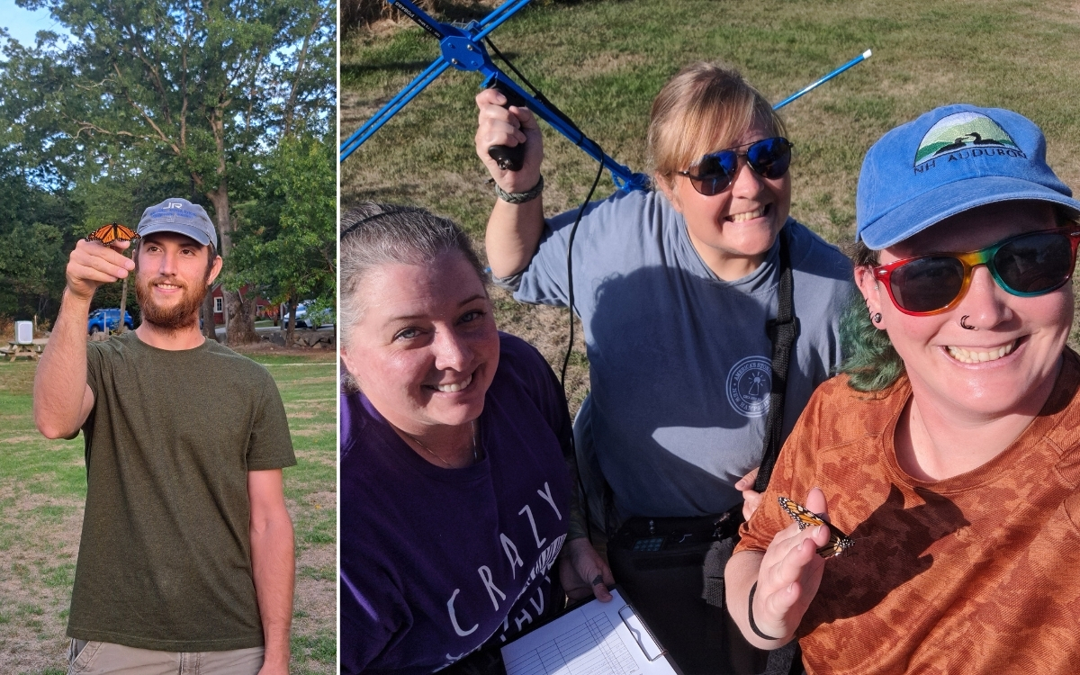 From 2022-2024, 130 Monarchs have been fitted with Lotek nanopins. In 2025, NH Audubon welcomed two collaborating biologists to join the tagging efforts: Amy O’Donnel of the US Fish and Wildlife Service in Maryland, and Dr. Micah Perkins of Owensboro Community and Technical College in Kentucky. Our combined efforts have yielded 74 tagged Monarchs during fall migration this year, bringing us to a total of 204 tags deployed! The small size of Lotek nanopins results in a short battery life of about 21 days. Through the tagging efforts of our southern collaborators, we expect our detection data to extend much further than in previous years, giving us a clearer picture of how Monarchs travel from their breeding grounds in the eastern United States to their overwintering habitat in Mexico. This work will allow NH Audubon biologists to identify areas along Monarch migration routes to enhance pollinator habitat with native wildflower plantings, providing migrating Monarchs with essential habitat to rest and refuel along their journey.