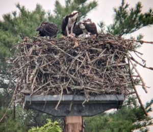 A single, stacked up Osprey nest, located at the south end of Lake Winnisquam in Belmont, has produced and incredible 49 fledglings since 1999. This year’s layer holds the three