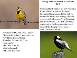 Grassland birds such as the Bobolink and Eastern Meadowlark are declining throughout their ranges. In this talk we review the history and ecology of these species, with a focus on New Hampshire