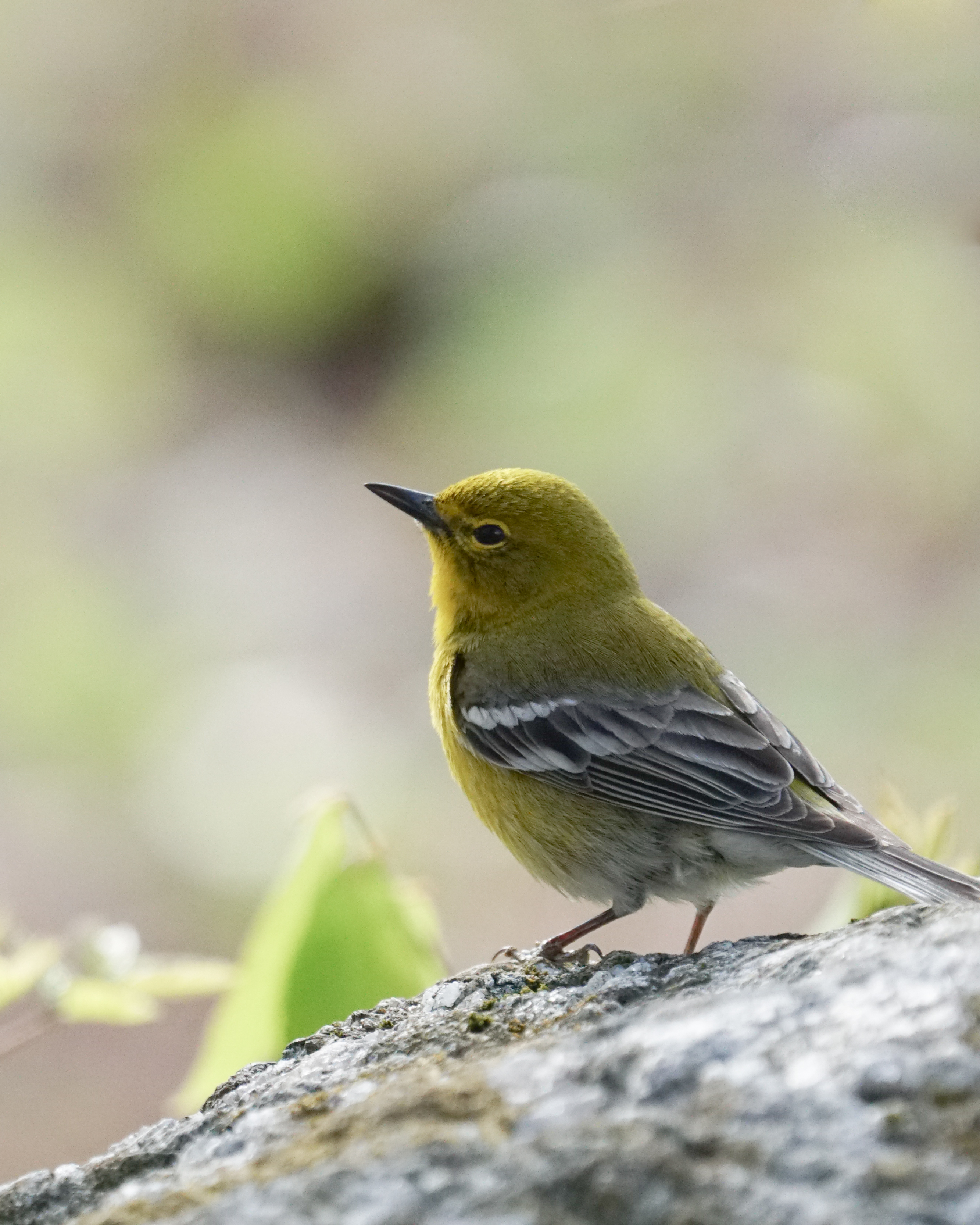 Photo of a Pine Warbler by Grace McCulloch. The earliest warblers arrive mid-month: Pine, Palm, and Yellow-rumped, followed quickly by Louisiana Waterthrush. The first warblers of the main May wave often appear at the very end of the month, including Black-and-white, Northern Parula, and Black-throated Green Warblers.