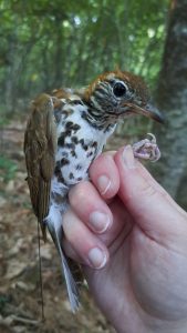 In areas such as the mid-Atlantic region and South Carolina/Georgia, where there are lots of Motus stations, an individual thrush may pass over several stations in succession over the course of a single night’s flight. In such cases, we can calculate a rough estimate of flight speed and a minimal estimate of migration distance. A sampling of the available data shows Wood Thrushes travelling between 40 and 60 mph, with some of the differences likely related to wind conditions. Two of the longest flights this fall were over 400 miles, in both cases from central NH to the Chesapeake Bay area. Both birds flew for at least 7.5 hours with an average speed of 57-60 mph. What’s harder to tease apart is how long birds rest between flights, since most of the time they land where there’s no station to detect them. The gap between arrivals in the mid-Atlantic and Southeast suggests stopover might average a week, but it will take more detailed analysis of the data to figure out that particular aspect of Wood Thrush migration ecology.
