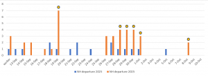 For starters, 32 of the birds tagged in 2025 are alive and well and on their way south, along with 10 of the 11 that returned from 2024. Departure dates ranged from late July to October 8, with half of them September 19-29. This departure schedule is roughly five days later than 2024, and large peaks of movement occurred on nights with good conditions for migration: generally strong west or north winds (Figure 1). These same winds helped thrushes move all the way into the mid-Atlantic region (e.g., Pennsylvania, Maryland) on the same days they left NH, and average first detection in that area was only two days later than NH departure. This contrasts with 2024, when average NH departure and mid-Atlantic arrival dates were five days apart, and there were fewer clear peaks. The reason? The fall of 2024 was marked by unusual easterly winds, and very few nights with optimal migration conditions. As a result, the 2024 thrushes spread themselves out over the entire departure range in late September. This year’s fall migrants arrived in the southeastern U.S. (SC, GA, FL) mostly during the first half of October, and by the end of the month, five had already crossed the Gulf of Mexico and been detected by a Motus station in Honduras. Of the five birds that were detected in Central America in the fall of 2024, three didn’t show up until after mid-October, so there is still plenty of time for more of the 2025 migrants to appear south of the border.