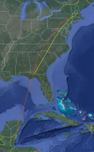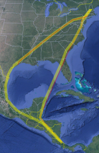 Back to those birds with three seasons of data. Figure 3 shows tracks for bird #597, one of three tagged at NH Audubon’s McLane Center in the summer of 2024. He flew south along the Appalachians (typical of most birds that fall) and eventually crossed the eastern Gulf of Mexico to the Yucatan. Where he spent the winter is anyone’s guess, but it was probably farther east in Nicaragua or Costa Rica. Like most other spring returns, he went undetected until he was almost back and probably spent the summer in the same territory he held in 2024. His next southbound flight follows the same general route south, a pattern typical of the other nine birds for which we have two falls of data. Overall, however, their paths seem shifted slightly to the southeast, and I wonder if this is because we didn’t have prevailing easterly winds in September and October of 2025.